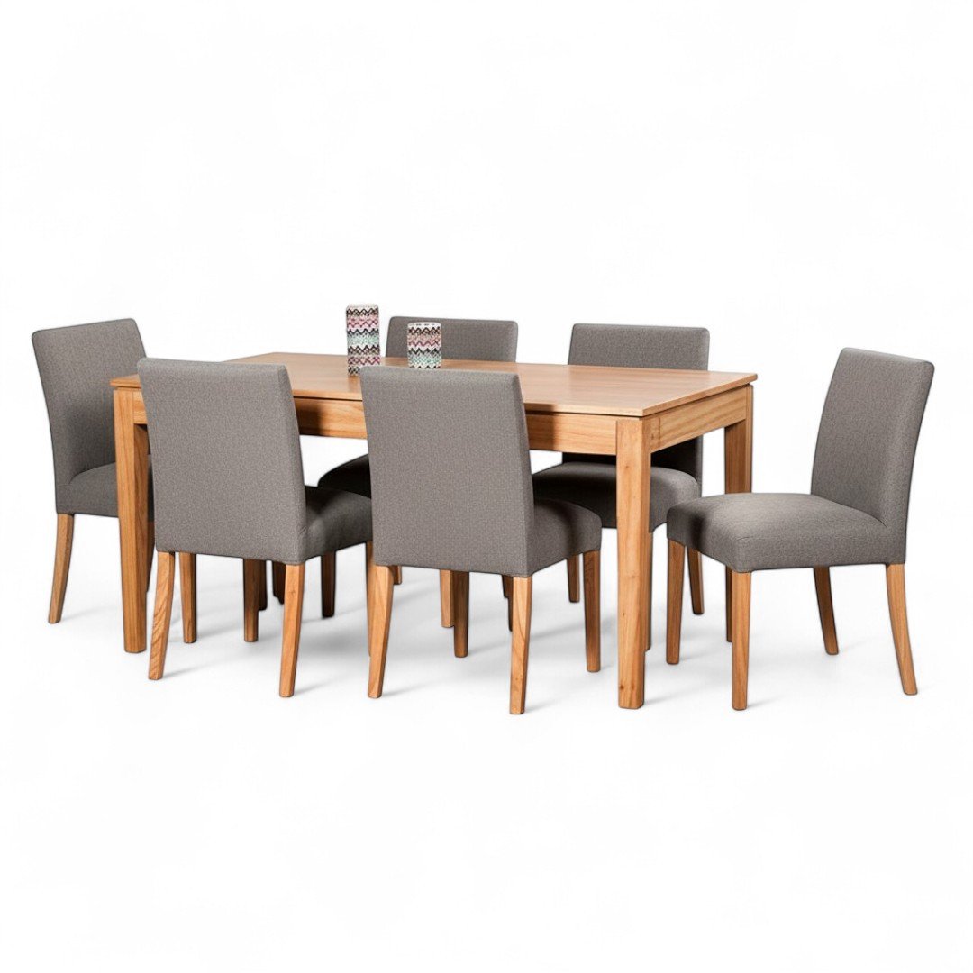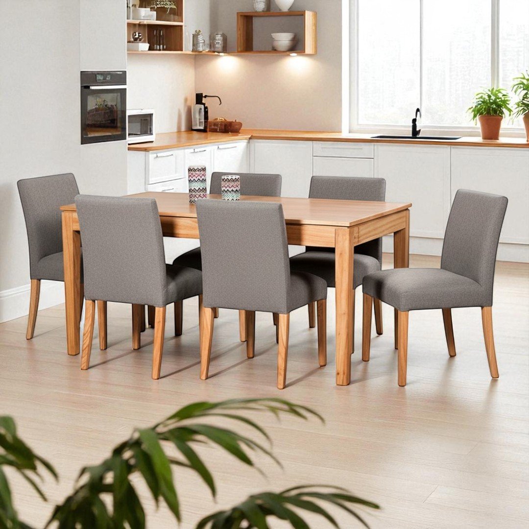 Renová tu espacio con este elegante juego de comedor para 6 personas, que combina diseño moderno, confort y la calidez de la madera natural.