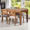 Este juego de comedor esta fabricado en madera paraíso es una madera semi pesada. Tiene una muy buena estabilidad y una excelente calidad. Sus marcadas vetas naturales le dan a los muebles una calidez y belleza especial. La madera puede presentar nudos y vetas propias de su terminación natural.