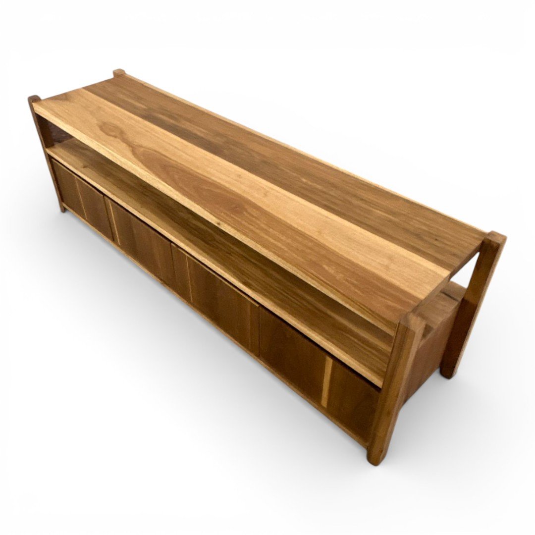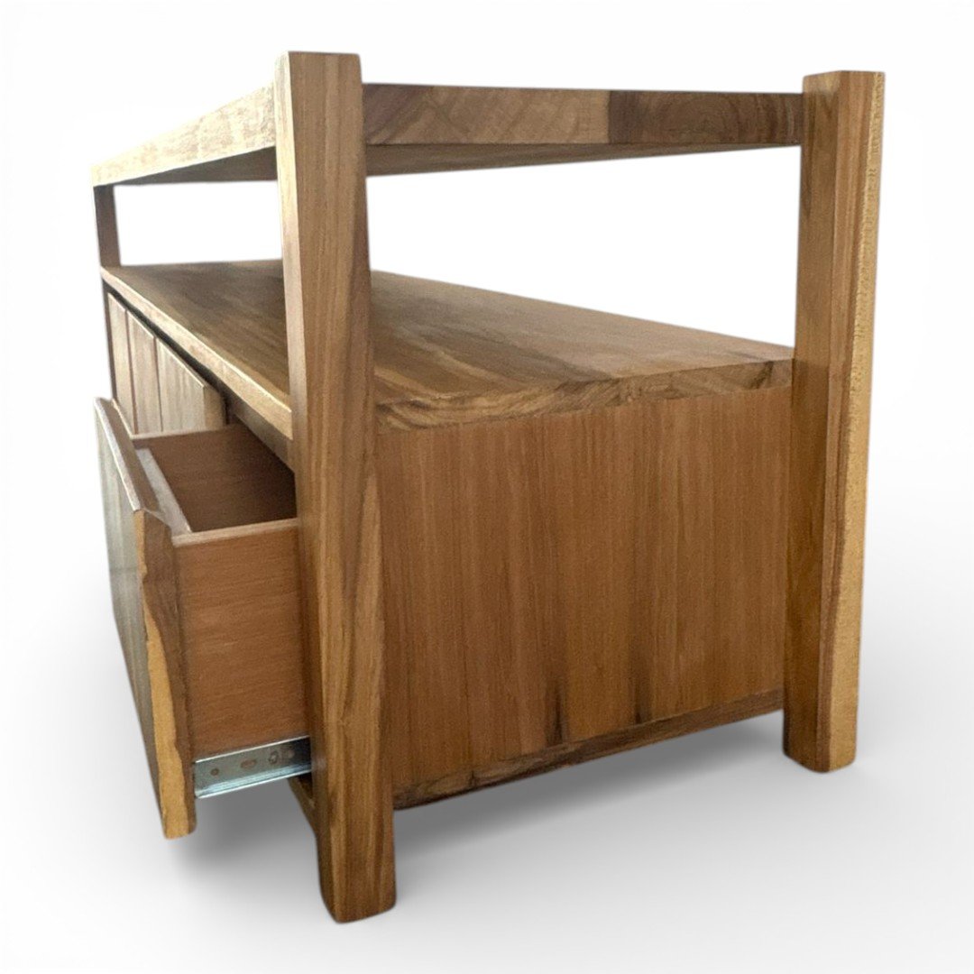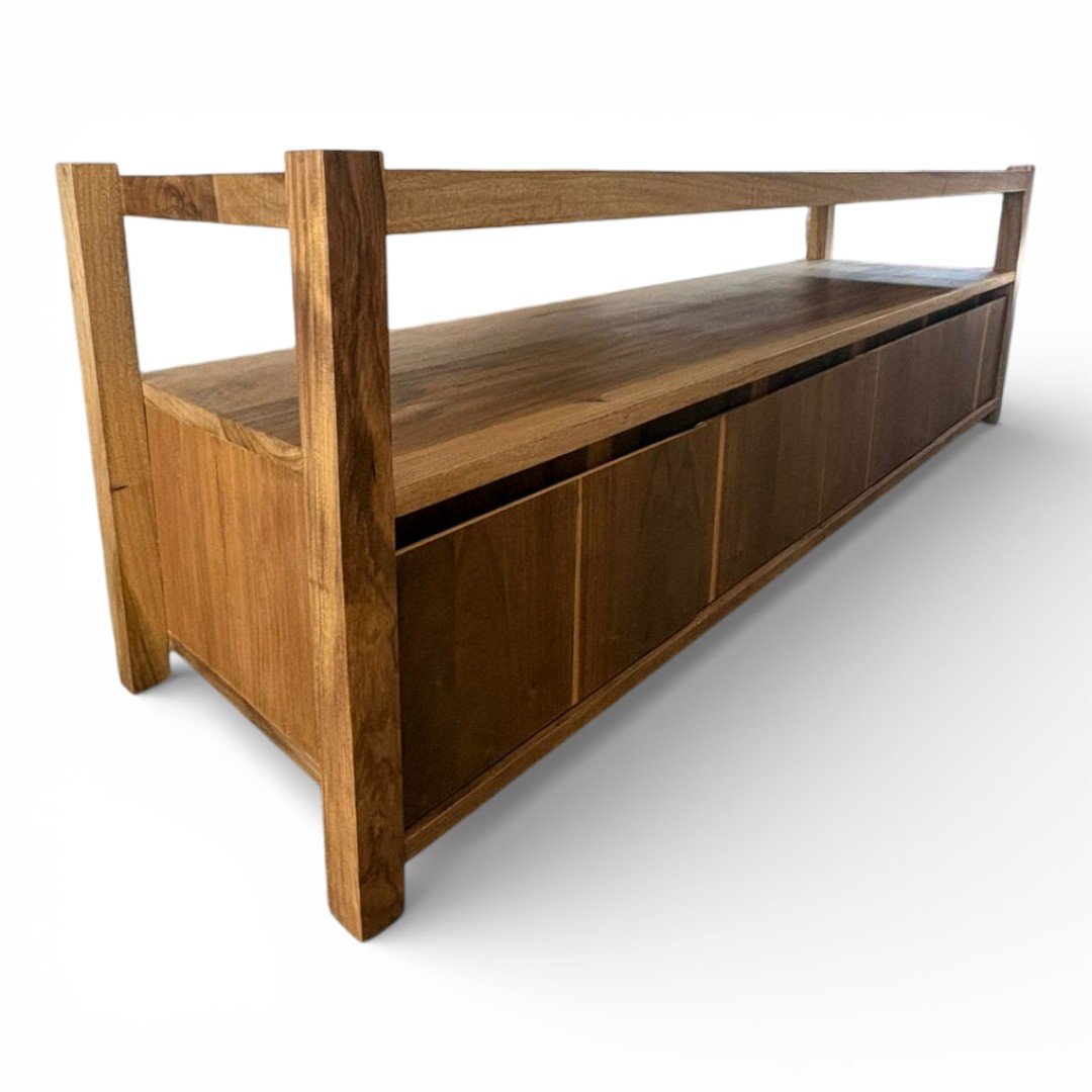 El Rack de TV Gala es la pieza que redefine tu espacio de entretenimiento. Fabricado en madera maciza de Petiribí, este mueble combina un estante superior abierto, ideal para dispositivos o decoración, con un amplio espacio de guardado inferior de frentes limpios que resaltan la continuidad de la veta natural. Su estructura robusta y detalles de ensamble a la vista lo convierten en un mueble de diseño superior. Esta pieza se puede fabricar en la medida que necesites y la cantidad de cajones que necesites.