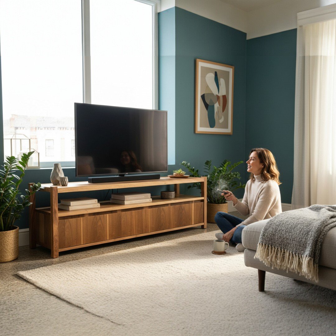Diseño de Guardado: Espacio abierto para equipos de audio/video y módulos inferiores cerrados con cajones.
