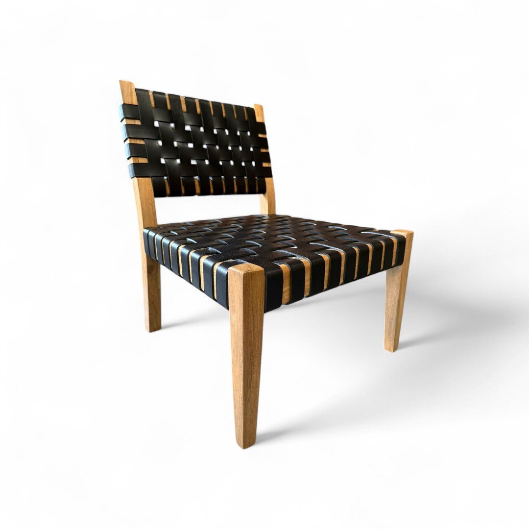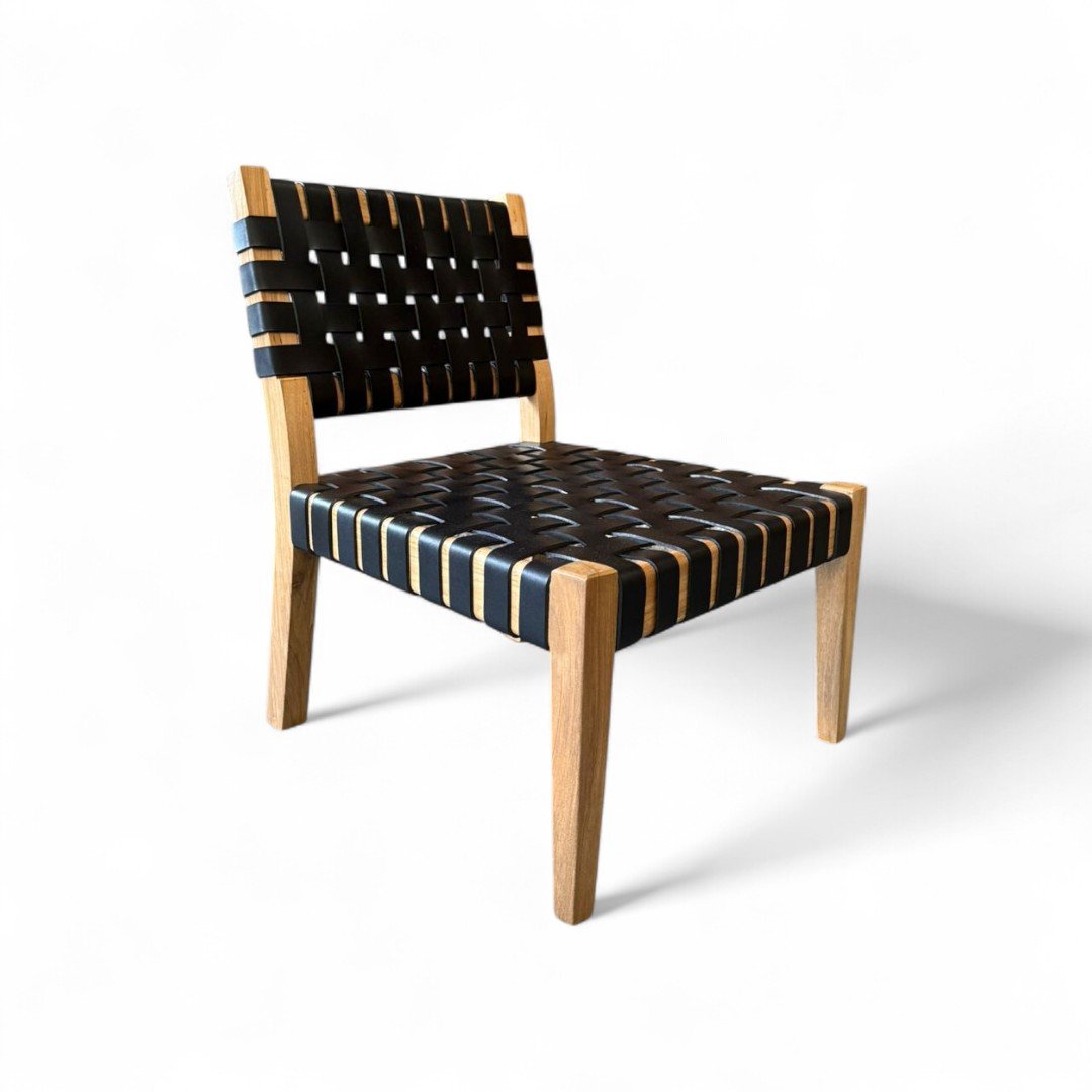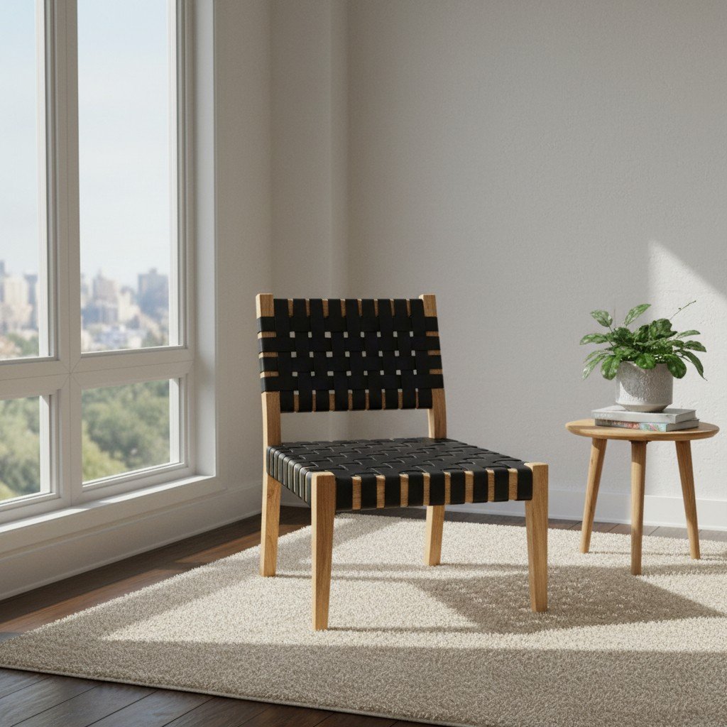 Sillon  matero en madera petiribi con asiento y respaldo tejido en cuero fusiona un diseño minimalista y elegante con materiales de alta calidad. Su estructura de madera petiribi garantiza durabilidad y resistencia, mientras que el cuero en el asiento y respaldo añade confort y sofisticación. Perfecto para quienes buscan un mueble que combine estilo nórdico con funcionalidad,  es ideal para espacios modernos que buscan un toque de distinción.