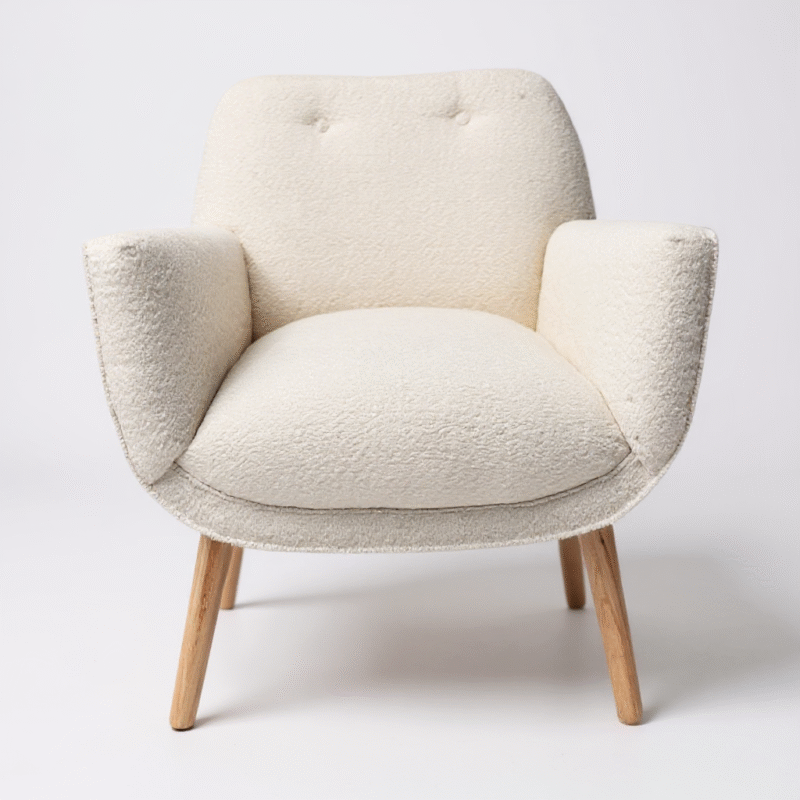 Sillon individual de un cuerpo tapizado en BOUCLE de fibra natural color a eleccion. Comodidad, comfort, con placas soft de 26 kg de densidad que aseguran mayor durabilidad.